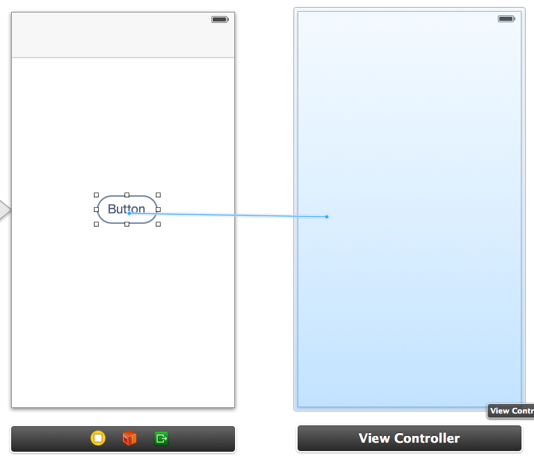 Hold the control key, click on the button, and drag the resulting blue wire onto the new view controller: