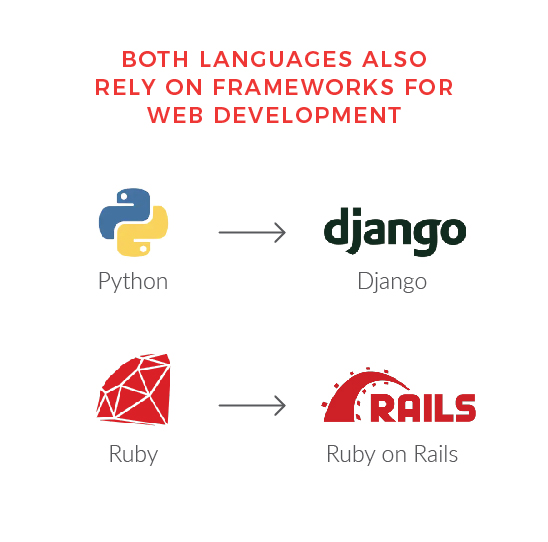 Both languages also rely on frameworks for web development: Python has Django, while Ruby has Ruby on Rails. These frameworks were developed using their respective languages and help support coding for web applications. Django and Ruby on Rails are also very powerful tools utilized by high-powered companies.