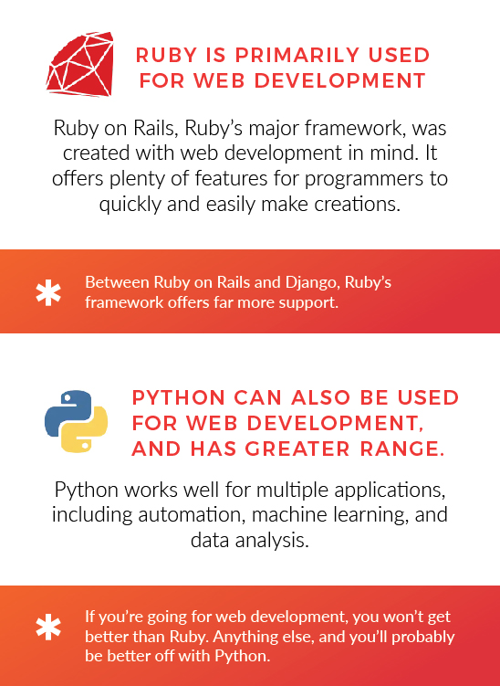 Of course, ease of understanding is all relative; it’s also worth looking into the application of both languages. So, what is Ruby used for? Primarily, web development. In fact, Ruby on Rails, Ruby’s major framework, was created with web development in mind. It offers plenty of features for programmers to quickly and easily make creations. Between Ruby on Rails and Django, Ruby’s framework offers far more support.